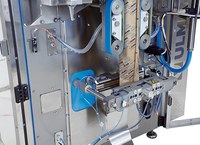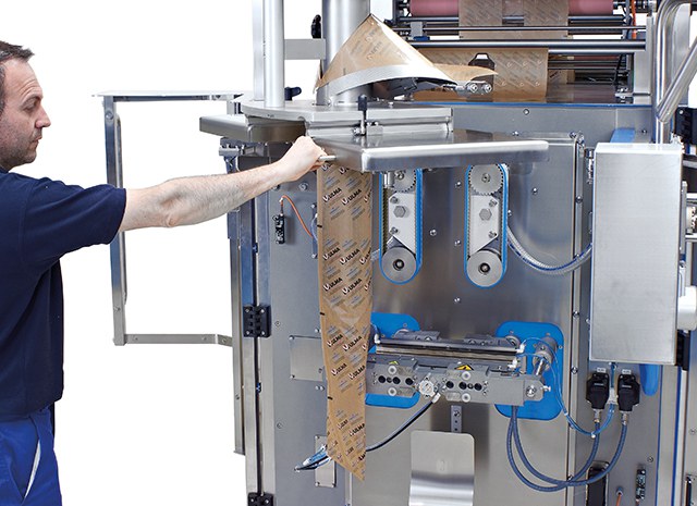 Máquina embaladora vertical (VFFS) de desenho higiênico com fácil troca de formato. Projetada para o embalamento contínuo em altas velocidades.