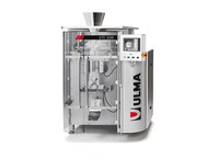 Máquina embaladora vertical (VFFS) que realiza uma embalagem de três soldas. Máquina vertical intermitente de alta gama para aplicações de velocidades médias-altas.