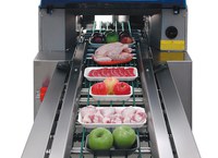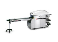 Máquina automática para a embalagem com filme extensível de produtos frescos em bandejas pré-formadas. Grande nível de produções, especialmente desenvolvida para centrais de embalagem.
