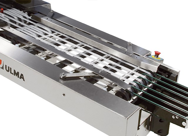 - Esteiras de saída por gravidade e motorizadas: em linha, a 90º e a 180º .