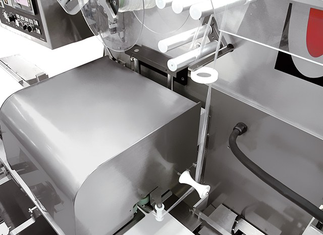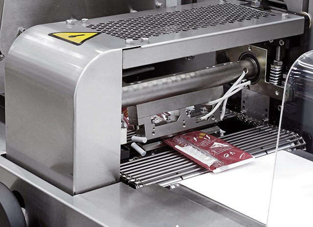- Sistema de selagem longitudinal por rolos de solda e arraste longitudinal do filme, com ajuste de altura para fácil ajuste.