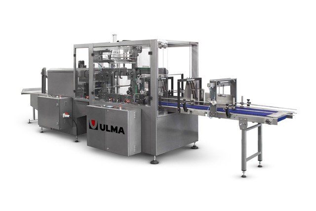 Enfaixadora automática em linha marca ULMA, modelo EPB, de design modular para embalar com filme retrátil em lâmina diferentes tipos de agrupações de produtos (uma altura).