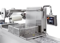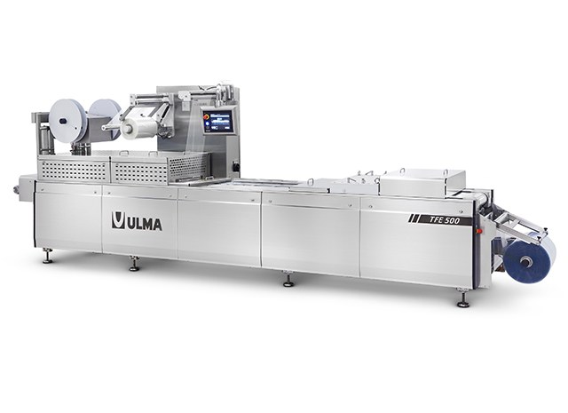 Máquina termoformadora para filme flexível ou rígido com possibilidade de embalagem com atmósfera modificada (MAP) e à vácuo. Máquina com nível de produção médio-alto.