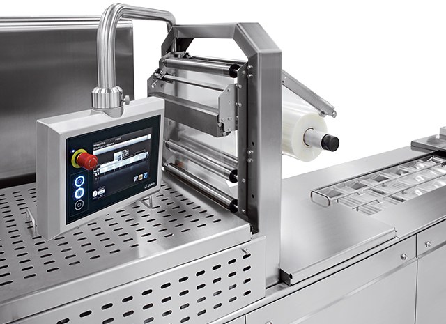 Máquina termoformadora higienizável para filme flexível ou rígido com possibilidade de embalagem em atmosfera modificada (MAP) e a vácuo. Máquina de nivel de produções médio-alto.