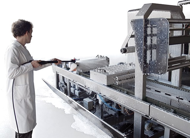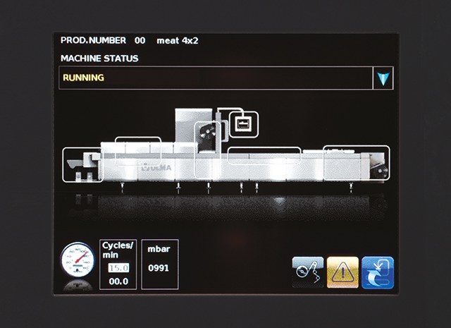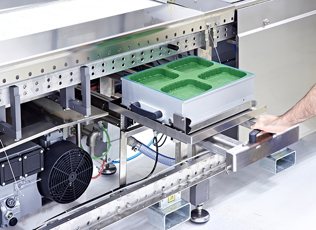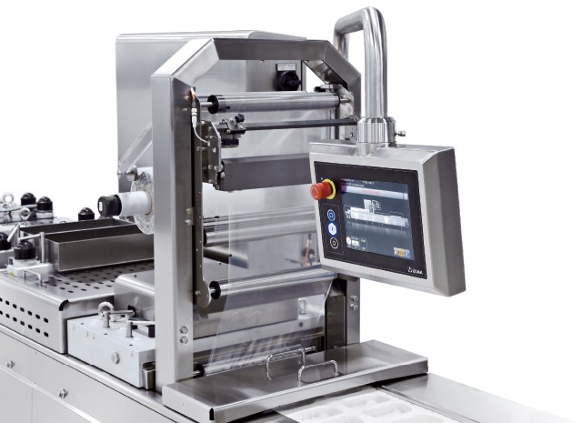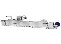 Máquina termoformadora higienizável para filme flexível ou rígido com possibilidade de embalagem em atmosfera modificada (MAP) e a vácuo. É a termoformadora higienizável de maior nível de produções.