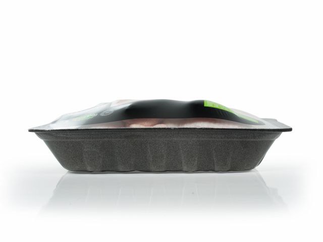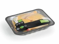 Aplicação para embalagem de cortes de frango como alternativa da embalagem FE, proporcionando a vantagem de que a embalagem é hermética e, portanto, os exsudados não migram para o exterior da embalagem, sujando e oxidando as prateleiras.