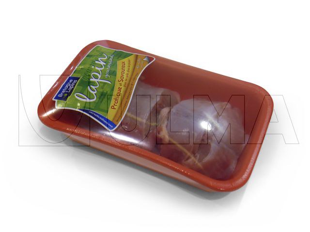 Pedaços de coelho embalados em Flowpack com bandeja em atmosfera modificada MAP e filme retrátil Barreira BDF 1398_1.jpg FM 300 Máquina embaladora Flow Pack horizontal (HFFS) que realiza três soldas totalmente herméticas obtendo uma embalagem tipo almofada e com atmosfera modificada (MAP) de alimentos frescos. Nível de produção alto.