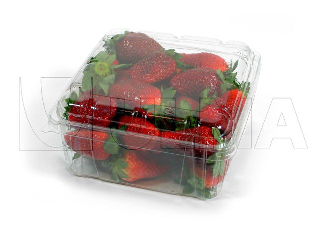 Morango em bandeja embalado com sistema de tampa automático.
