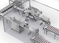 Essa célula de encaixotamento consiste em um robô que coleta as embalagens flow pack das duas linhas e as introduzem nas caixas de papelão.