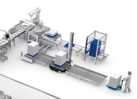 A célula de paletização consiste em um robô antropoformo responsável pelo empilhamento das caixas nos paletes.