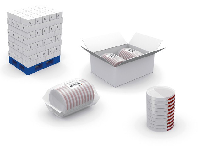 As duas linhas de embalagem em flow pack recebem as placas de Petri em pilhas verticais que são viradas antes de serem embaladas no clássico formato almofada.