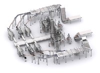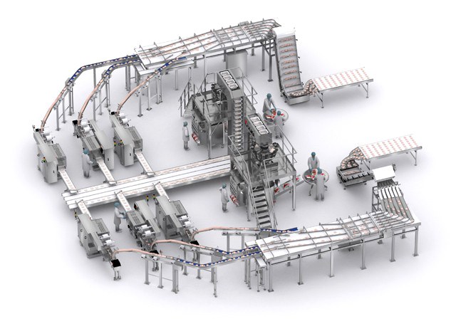 A instalação inclui um sistema para transportar e distribuir hamburgueres congelados. O produto recebido é distribuído para as diferentes linhas de embalagem individuais por meio de rampas e guias de alinhamento.