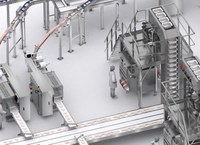 As embalagens previamente fabricadas individualmente são colocadas em uma esteira que vai para um sistema de elevação para alimentar o multicabeçotes de combinação que, por sua vez, alimentam as embaladoras verticais que realizam a embalagem multipack em bolsas.