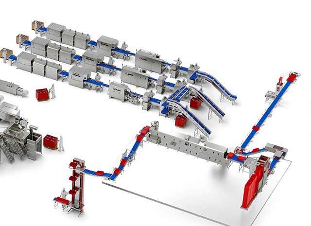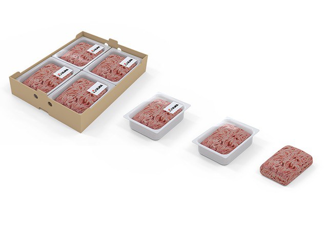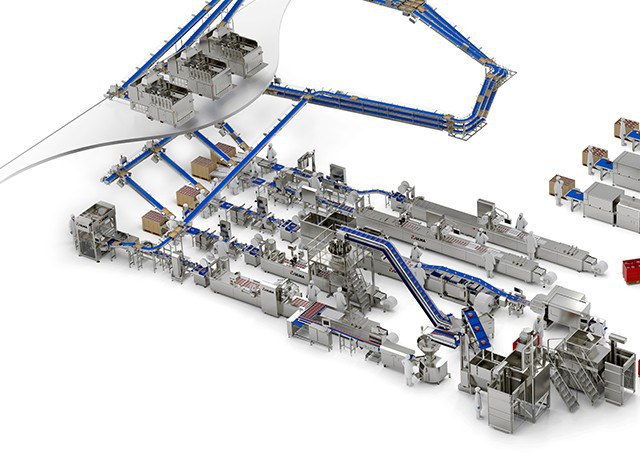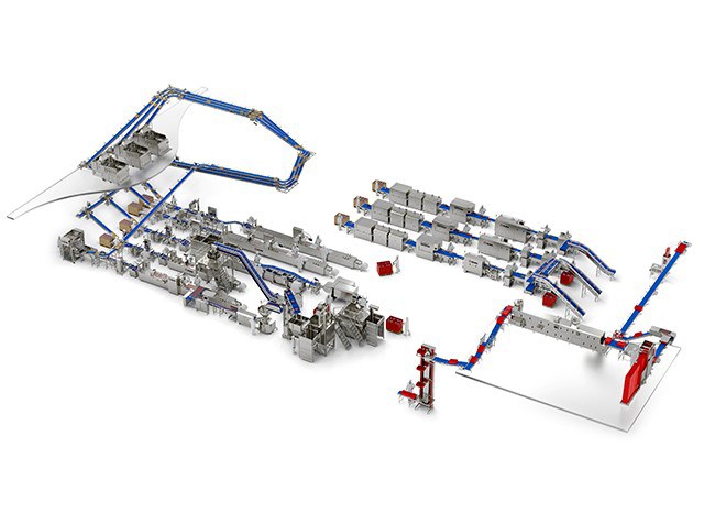 A solução completa de automação para a fábrica de embalagens inclui oito linhas de embalagem para diferentes produtos cárneos. Desde peças grandes embaladas a vácuo em FLOW-VAC® e termoformação, filetagem e carne moída em atmosfera modificada.