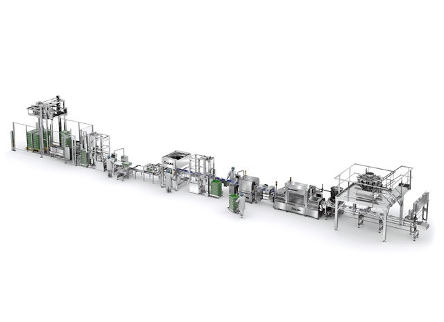 A linha começa com um desempilhador de bandeja que possui um pulmão de empilhamento de bandeja para alimentar a cadência exigida pela termoseladora.