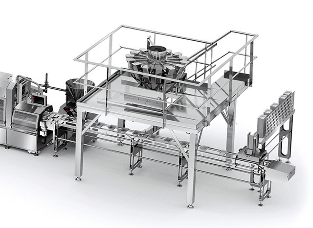 A balança de cabeçotes múltiplos carrega as bandejas no carro para que um dosador forneça continuamente o molho ao produto.