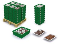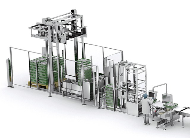 A célula do encaixotamento robotizada carrega as caixas plásticas com as bandejas termoseladas, seguidamente e de modo automático para que sejam fechadas as caixas e que possam ser empilhadas.