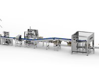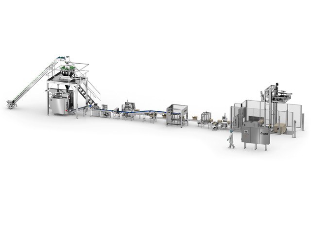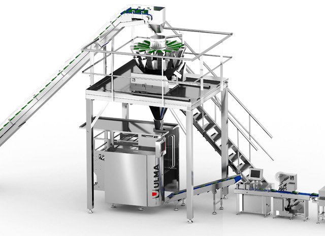 A linha começa com um elevador de produtos que alimenta o dosador múlticabeçotes de combinação que realiza as dosagens necessárias para que a embaladora vertical faça a bolsa de produto congelado.
