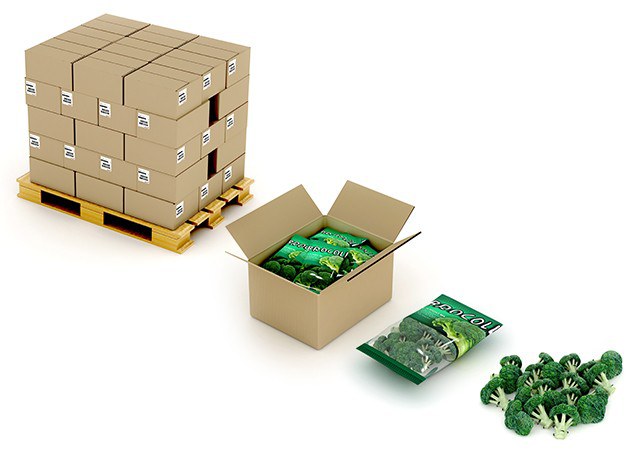 Posteriormente, por meio de um sistema de encaixotamento do drop-down, as bolsas de brócolis congelados são empilhados dentro da caixa de papelão, aproveitando ao máximo o volume disponível.