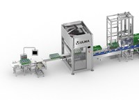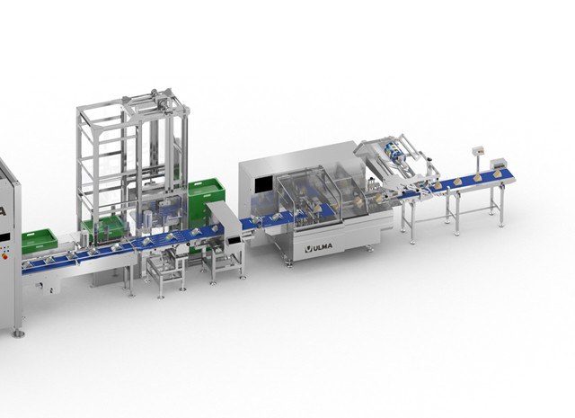 A linha possui um desempilhador automático para caixas vazias para alimentar a célula robotizada de encaixotamento.