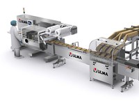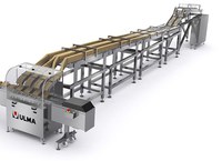 O sistema de alimentação conta com quatro filas de produto que vêm de canto e através de calhas vibradoras que giram e depositam no carro de alimentação da embaladora.