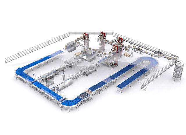 Uma vez preenchidas, as caixas sobem pelo elevador até o andar superior e, em seguida, são automaticamente fechadas e entregues através de esteiras de transporte e uma espiral descendente para a área de produto acabado.