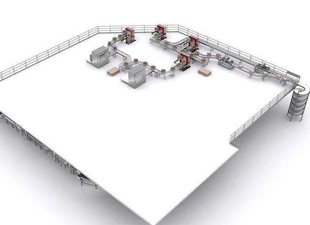 No piso superior, existem dois formadores de caixas que os formam a partir de uma prancha e depois alimentam o sistema de transporte e descensores de caixas que abastecem o piso inferior, onde as máquinas de embalagem estão localizadas.