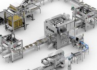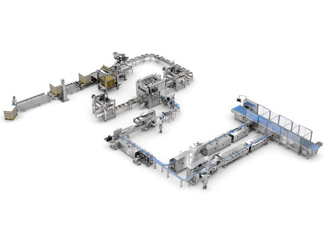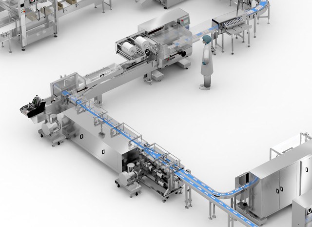 Através de um sistema que executa o agrupamento das embalagens unitárias, uma terceira flow pack realiza as embalagens multipack.