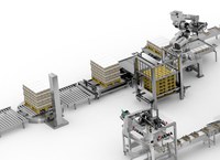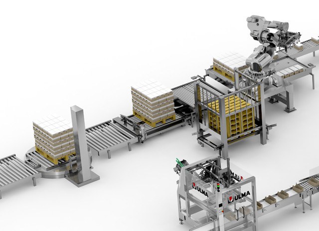A paletização robotizada é responsável pela realização de paletes de caixas que são finalmente enfardados com filme plástico estirável.