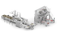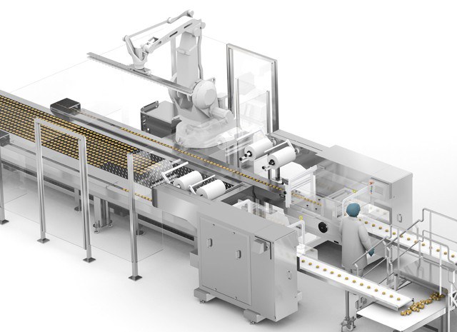 Através de um robô antropomórfico, os muffins do forno são removidos e carregados no carro de alimentação da embaladora Flow Pack.