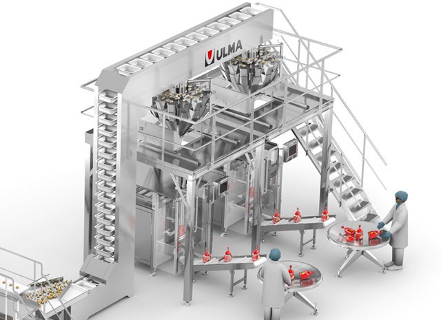 Através de esteiras transportadoras e um elevador de caçambas, as embalagens unitárias são transportadas para as balanças multicabeçotes que executam as dosagens de agrupamento estabelecidas.