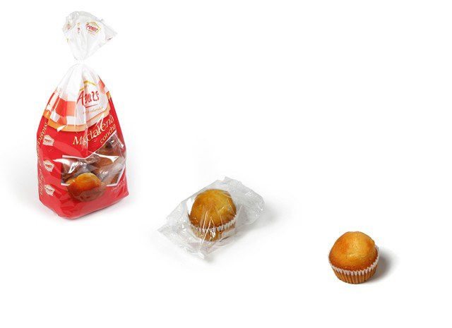 Duas embaladoras flow pack realizam a embalagem unitária de cada muffin.